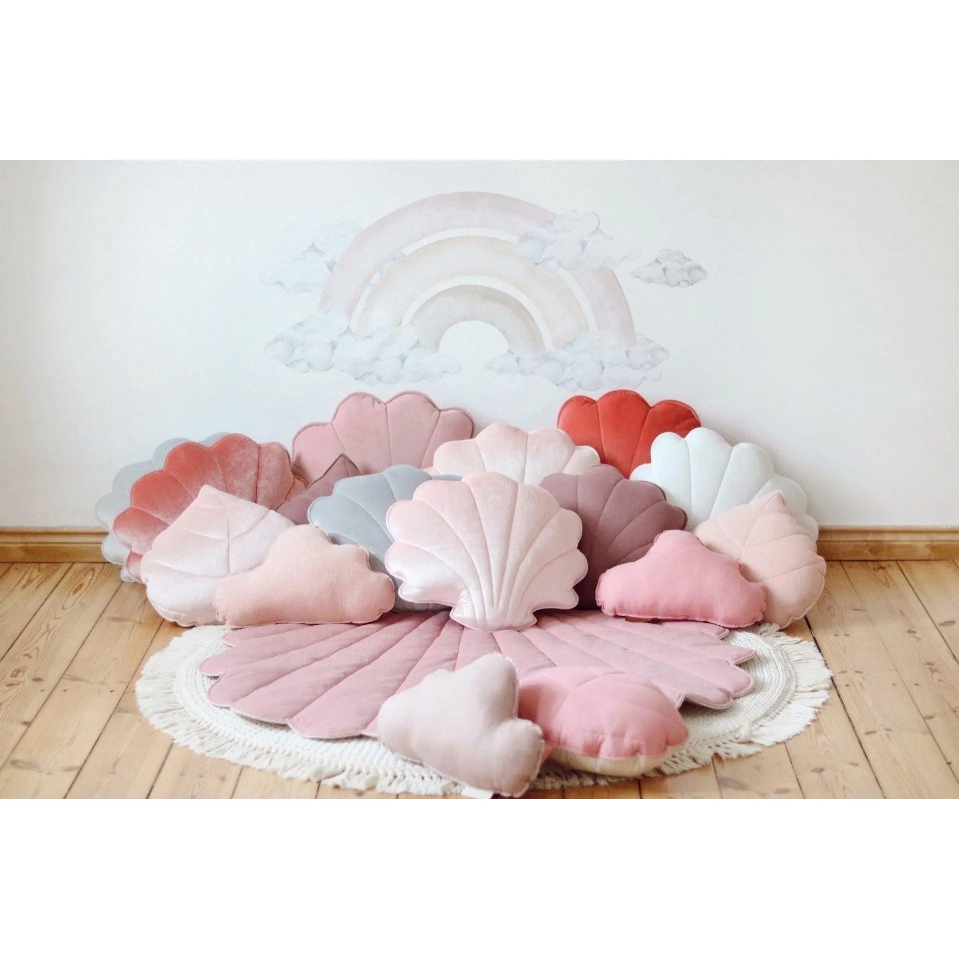 🌿 This mat is a great addition to a child's room, where it can serve as a comfortable rug or decorative element. Its soft pink shade and shell shape will add a touch of elegance and delicacy to the room. The pad is made of soft velor material, which is pleasant to the touch, and of coarse natural cotton in beige color.